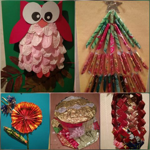 В ноябре, в нашем детском саду была объявлена выставка «Волшебные фантики». Родители и дети откликнулись с энтузиазмом. И закипела работа. Выбирали для своих поделок самые красивые фантики и представили на выставку свои работы. Получились яркие, красочные и необычные поделки! Как по мановению волшебной палочки фантики превратились в бабочек, птичек, рыбок.