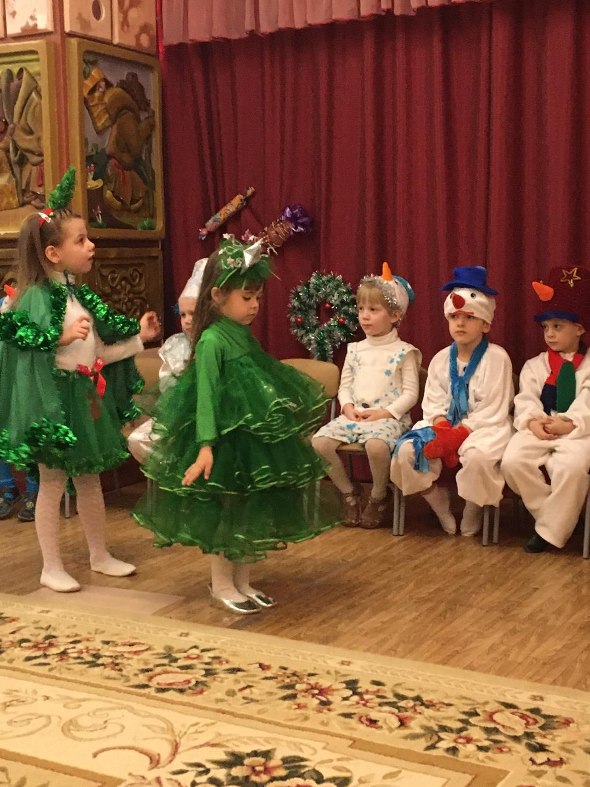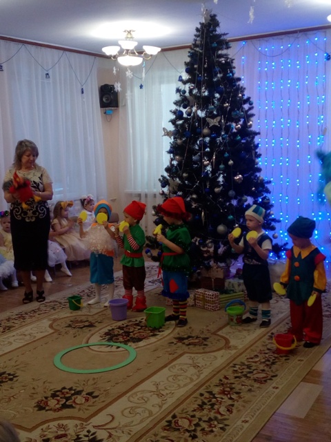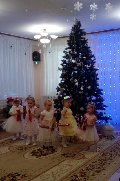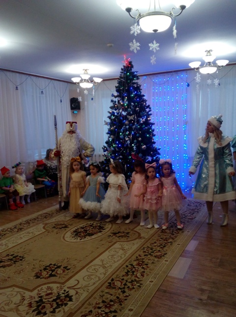 В младшей группе дети попали в магазин игрушек где продавцами были Мальвина и Гном. Дедушка Мороз своими волшебными заклинаниями оживлял игрушки и они начинали танцевать и петь на глазах у всех зрителей.